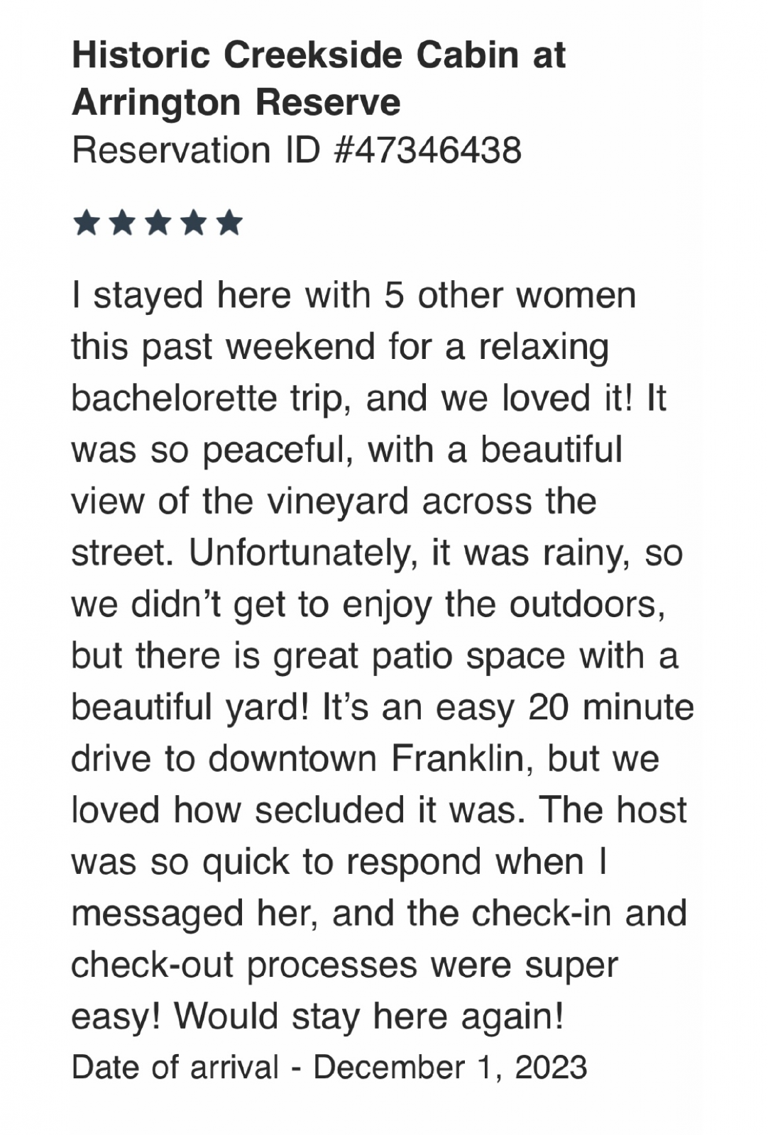 Enjoy this tranquil and historic getaway located near the road right across from Arrington Vineyards, the premier winery in Nashville’s Wine Country. A wonderful and unique two-story historic cabin with kitchen and balconies on a farm and newly planted orchard in Arrington, TN, located 30 miles from downtown Nashville.